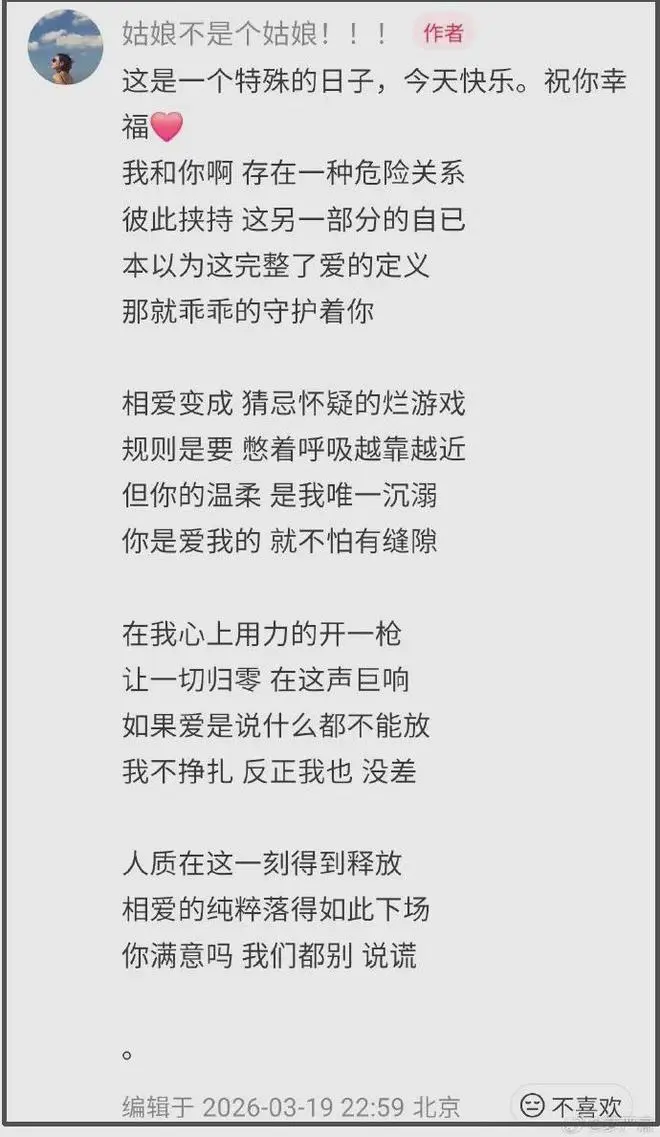 她托董璇找专业离婚律师,反复咨询财产分割、抚养权问题,仔细盘算离婚后独自带两个孩子的生活;她悄悄删掉社交平台上所有和宋宁峰的恩爱合照、过往甜蜜动态,抹去这段婚姻存在过的痕迹;3 月 17 日,她发文:“这是一个特殊的日子,今天快乐,祝你幸福”,配上《人质》的歌词 ——“相爱的纯粹落得如此下场,你满意吗,我们都别说谎”。一字一句,没有歇斯底里,没有怨天尤人,只有被伤透之后的释然,和再也不回头的决绝。