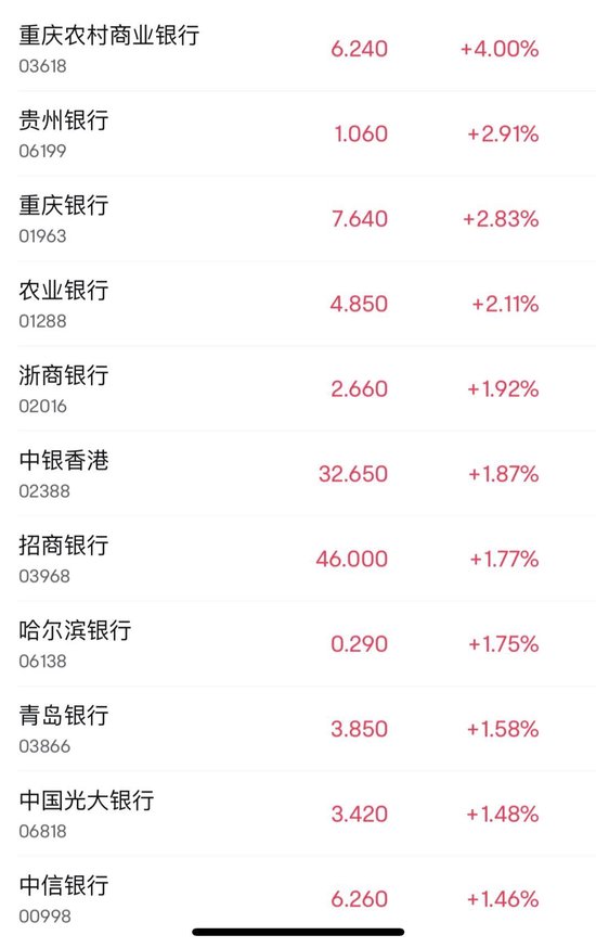 5月9日,港股内地银行股活跃,多数走高。截至收盘,重庆农村商业银行涨4%,重庆银行、农业银行涨超2%,中银香港、浙商银行、招商银行涨超1%。