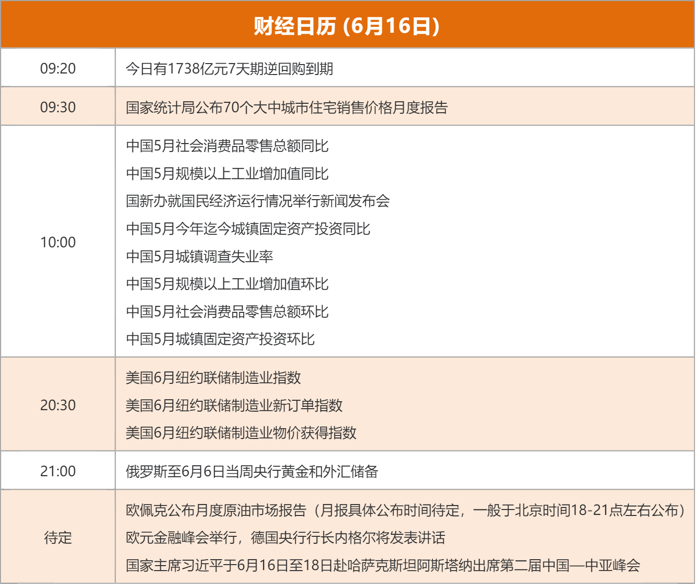 美债:美债收益率集体上涨,2年期美债收益率涨4.81个基点报3.945%,3年期美债收益率涨4.17个基点报3.900%,5年期美债收益率涨4.20个基点报4.003%,10年期美债收益率涨4.54个基点报4.405%,30年期美债收益率涨5.36个基点报4.896%。美国消费者信心指数大幅回升至60.5,远超预期;一年期通胀预期从5月的6.6%降至5.1%,短期避险情绪消退,促使资金回流美债市场。