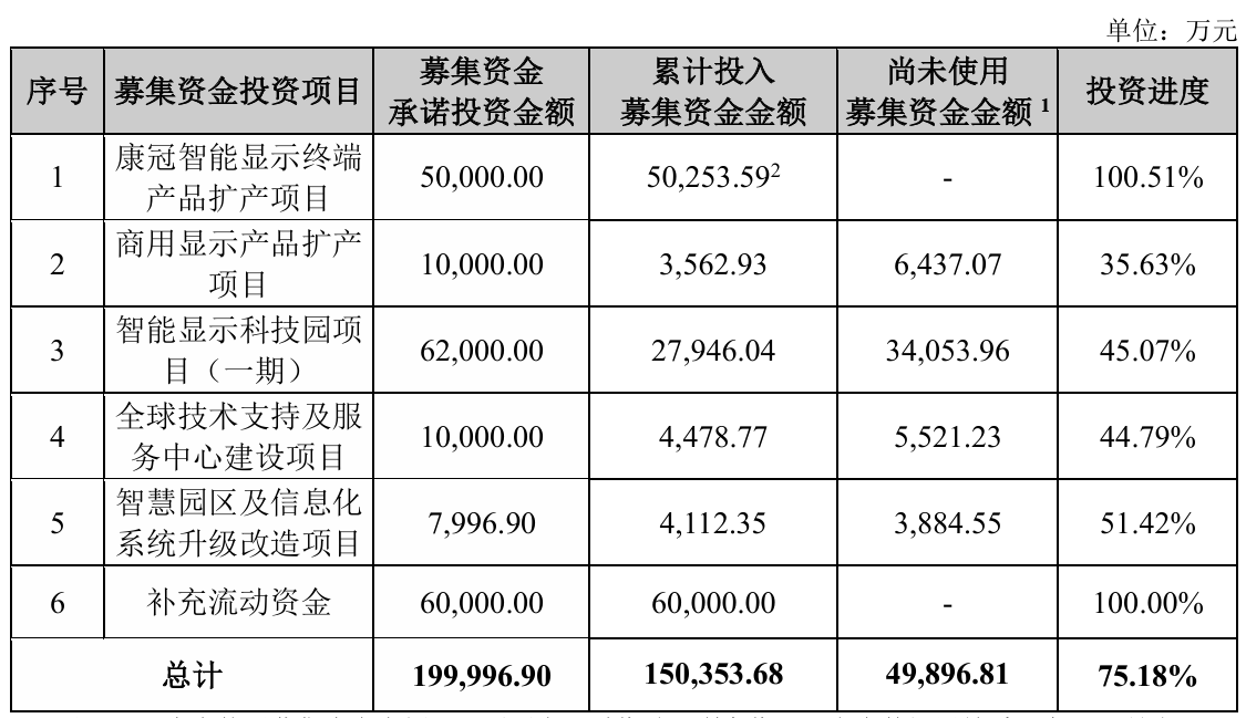 关于延迟的原因,公告表示,“商用显示产品扩产项目”在实施过程中,受厂区面积限制及其他客观环境影响,叠加建设周期较长,导致项目实施进度有所延缓。